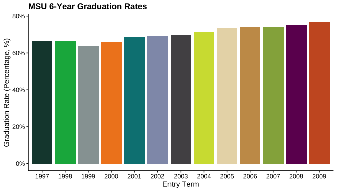 The MSUthemes package includes a comprehensive dataset (BigTen) with historical data (1996-2023) for all 18 Big Ten institutions, making it easy to create relevant examples and explore the colour palettes.