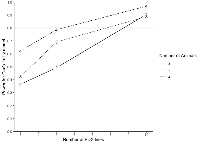 Alternatively, we may also conduct power analysis based on median survival of two randomized arms. We suppose that the median survival of the control and treatment arm is 2.4 and 4.8, allowing a PDX line has 10% marginal error (tau2=0.1) of treatment effect and an exponential event time, a power analysis may be done as below: