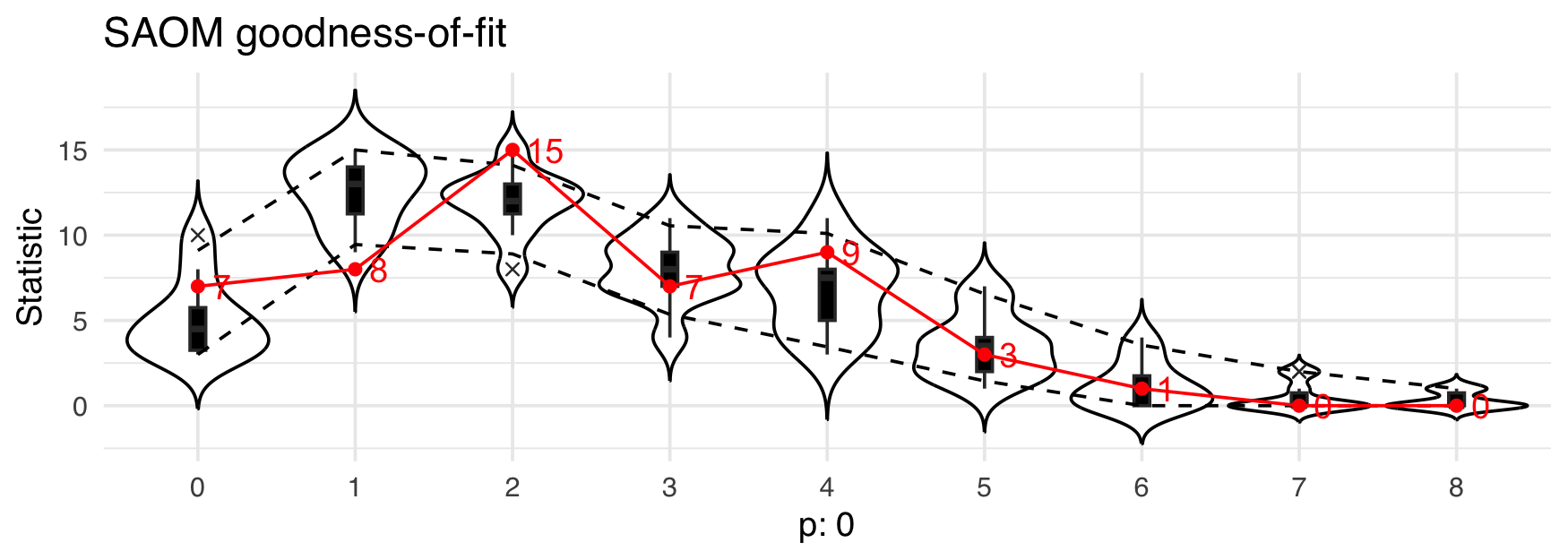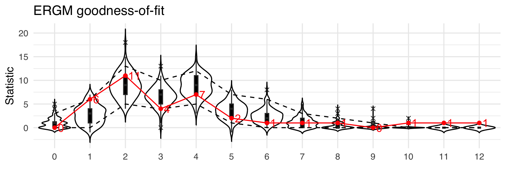 Since network analysis involves not just drawing graphs, {autograph} also provides a function for plotting results from the analysis or modelling of those networks. To keep things simple, all users need to remember is a single, generic function: plot(). Method dispatching takes care of the rest, so you can concentrate on exploring and interpreting your results. Here are some examples, using goodness-of-fit results from fitting a SAOM in {RSiena} and an ERGM in {ergm}. (Note that neither the data nor the model are similar; this is just for illustrative purposes.)