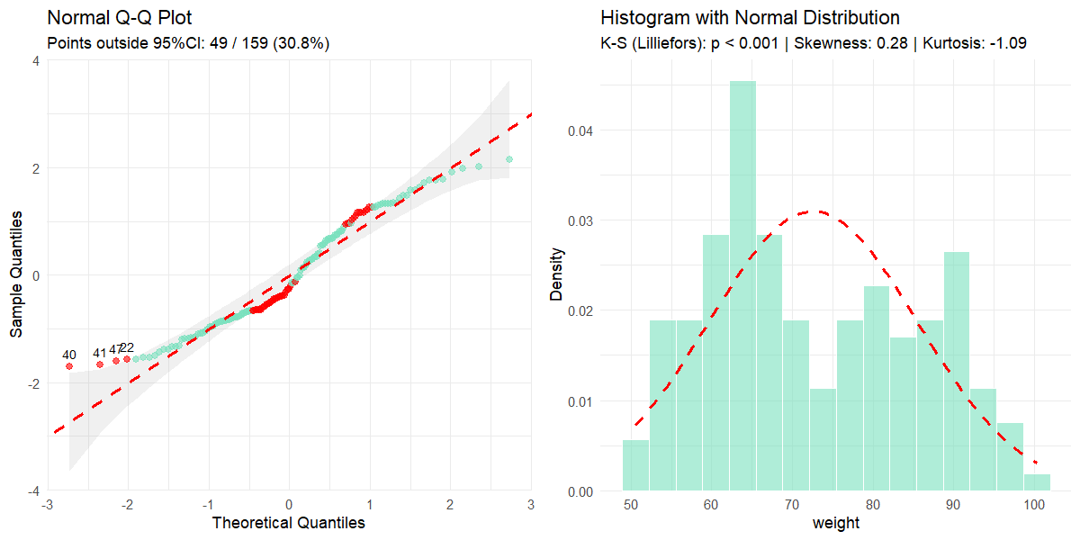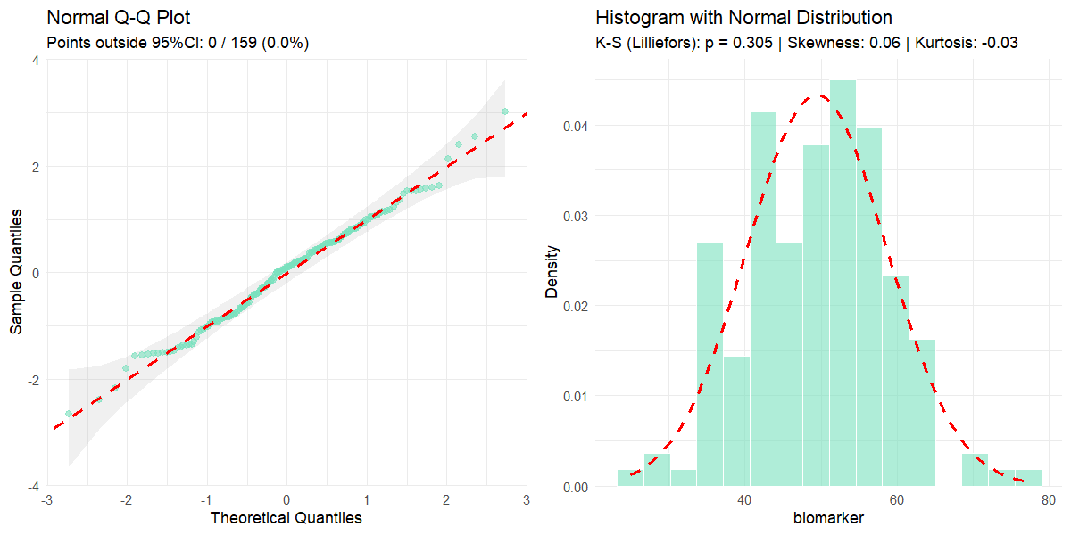 normality_test Character string indicating the normality test to use: ‘S-W’ for Shapiro-Wilk or ‘K-S’ for Kolmogorov-Smirnov. 'S-W'