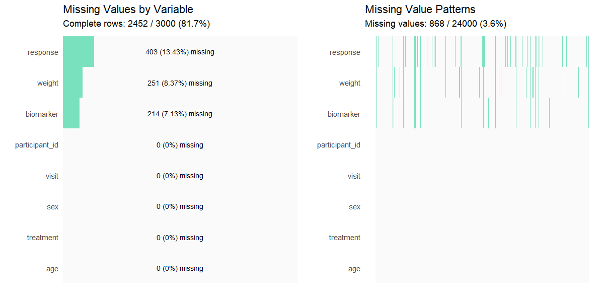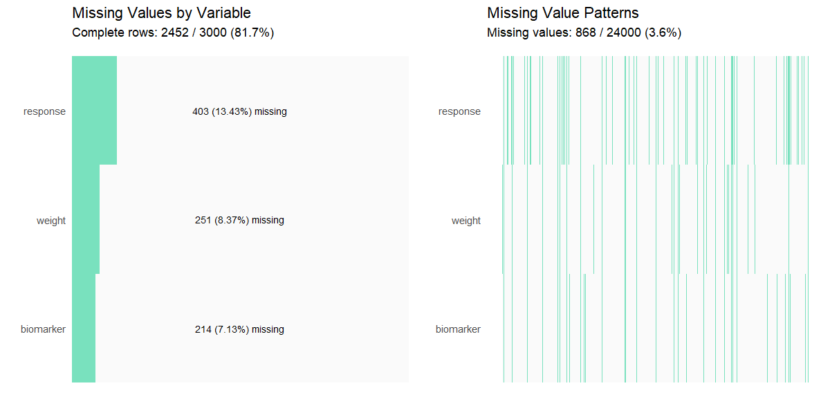 missing Numeric parameter indicating the proportion (0-1) of missing values to be introduced across numeric variables with fixed proportions (biomarker = 15%, weight = 25%, response = 60%). 0