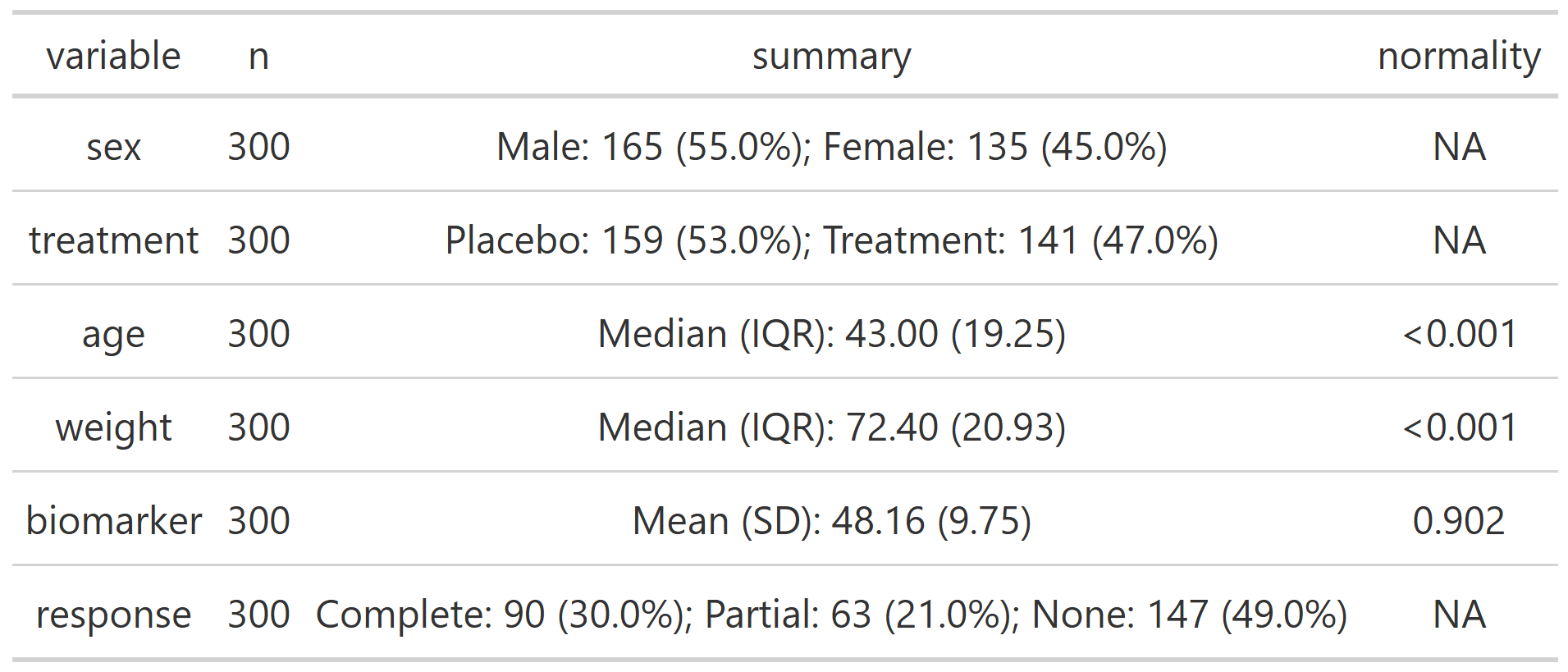 # Overall summary without considering treatment groups