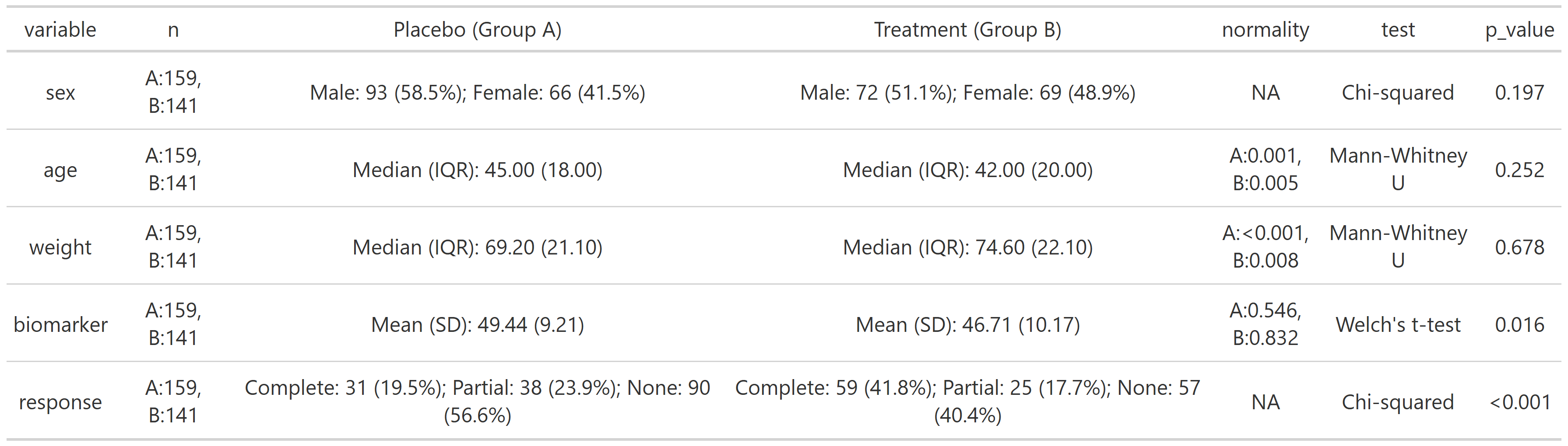 #>    participant_id visit    sex treatment age weight biomarker response