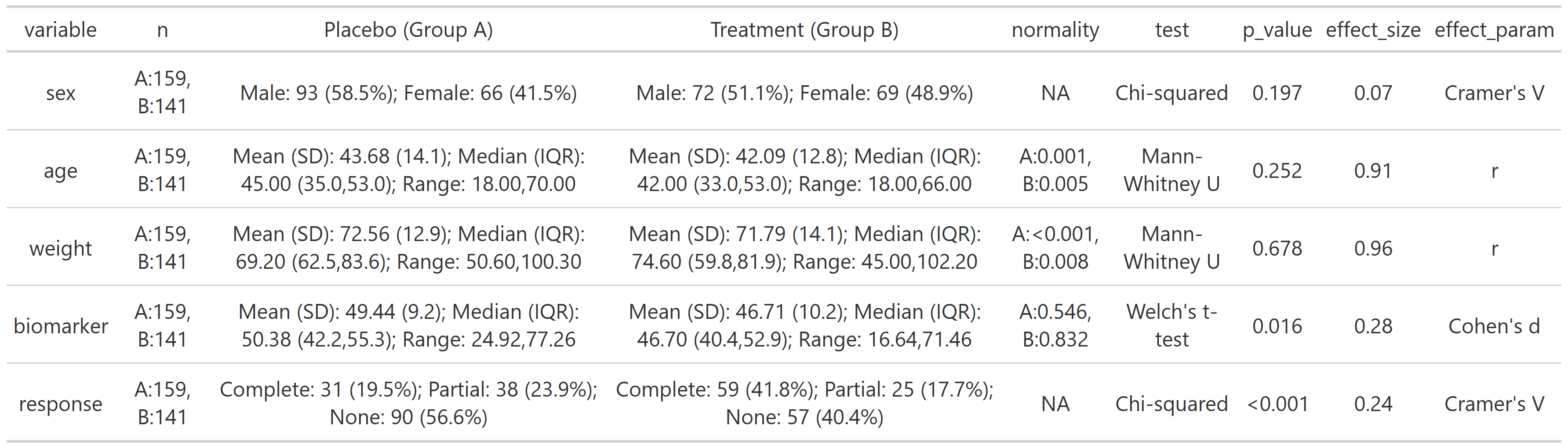 Generates a summary table for biostatistics and clinical data analysis with automatic normality, effect size, and statistical test calculations. Handles both numeric and categorical variables, performing appropriate descriptive statistics and inferential tests for single-group summaries or two-group comparisons.