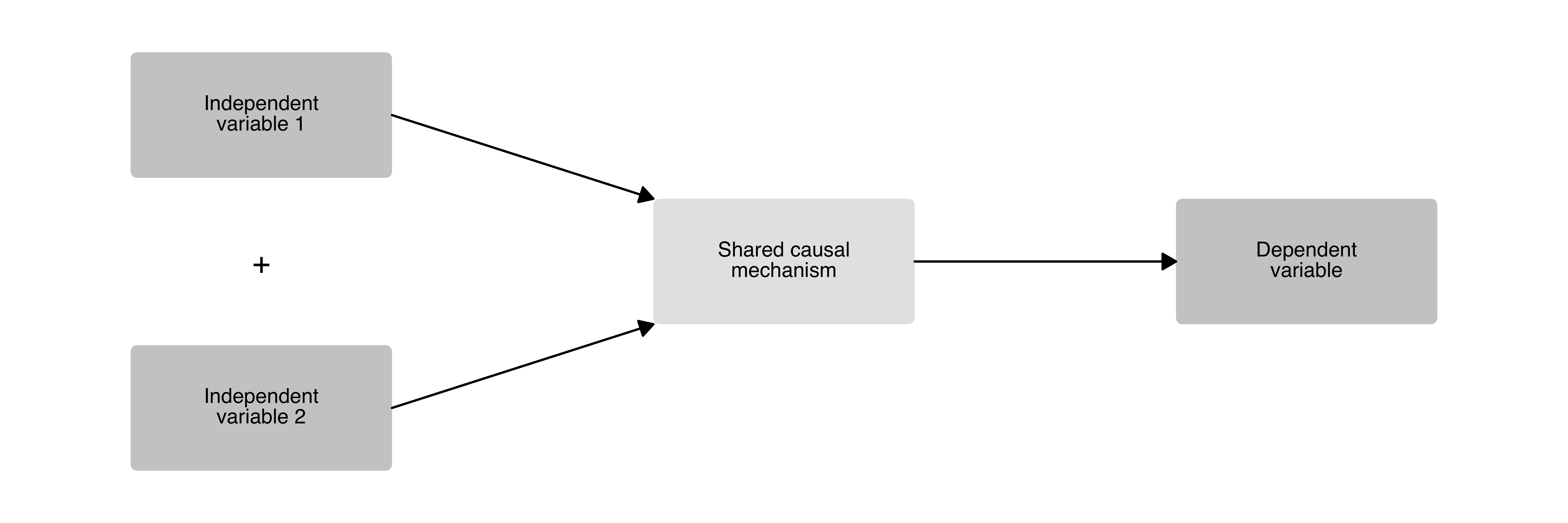 A causal diagram with two independent variables, each operating through its own mechanism, converging on a single outcome. A “+” sign indicates that both mechanisms are necessary.