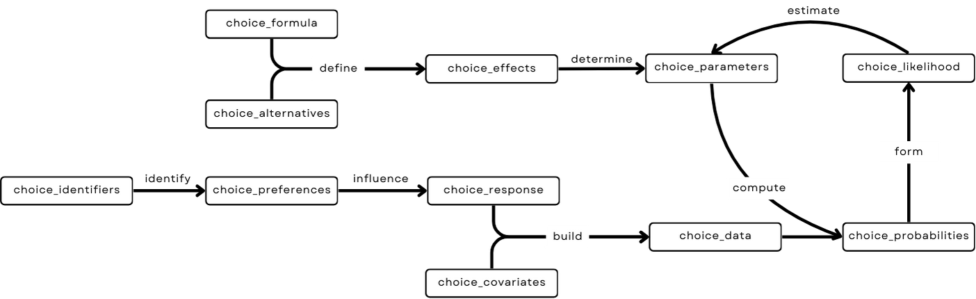 The package breaks down the process of modeling choice data into a series of steps. Each step is represented by an object that contains the necessary information for the subsequent step.