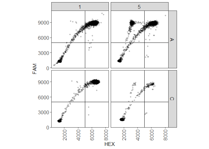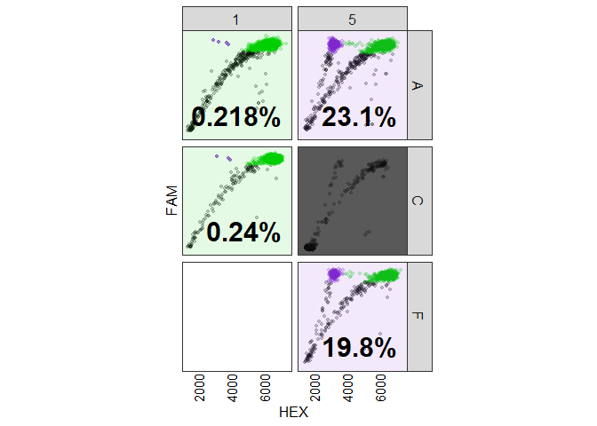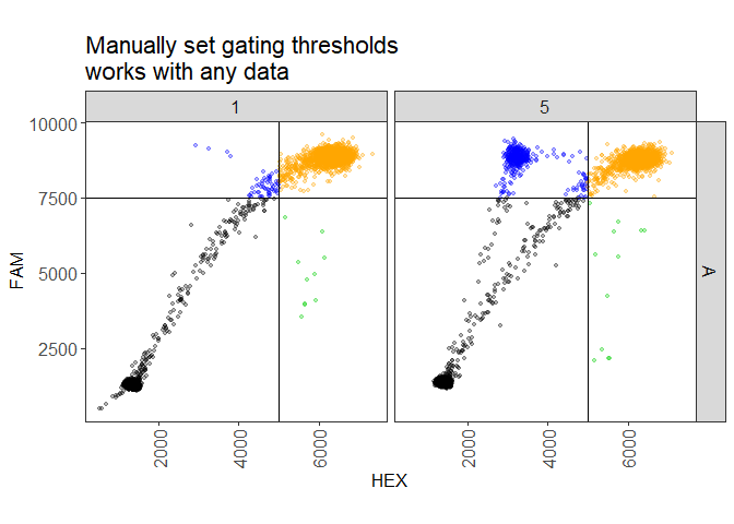 Here are two basic examples of how to use ddpcr to analyze and plot your ddPCR data. One example shows an analysis where the gating thresholds are manually set, and the other example uses the automated analysis. Explanation will follow, these are just here as a teaser.