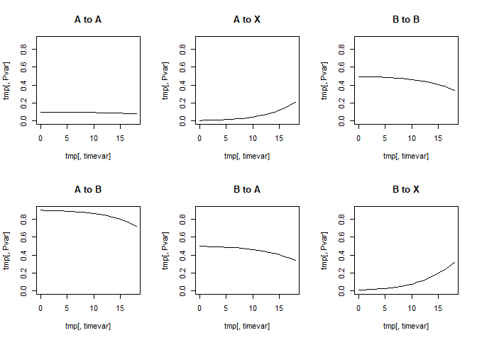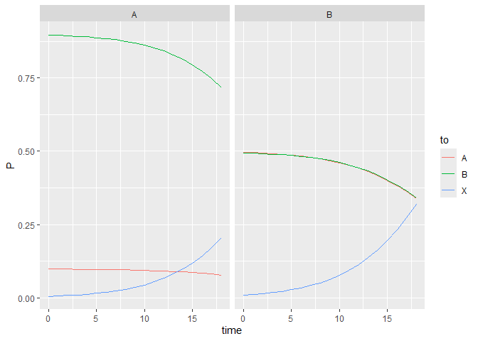 The arguments transient and absorbing take the names of the transient and absorbing states, respectively, which are specified as character vectors. In example above, there are two transient states called A and B, and one absorbing state called X. Each model needs at least one transient state and one absorbing state. The argument timescale takes the values of the timescale which are specified with a numeric vector. In this example, the time scale starts at 0 and stops at 19, with a step length of 1. The step length does not need to equal 1; e.g., 0, 2, 4, 6, … would be fine. Moreover, using the argument timestep, several values for the step length can be specified.