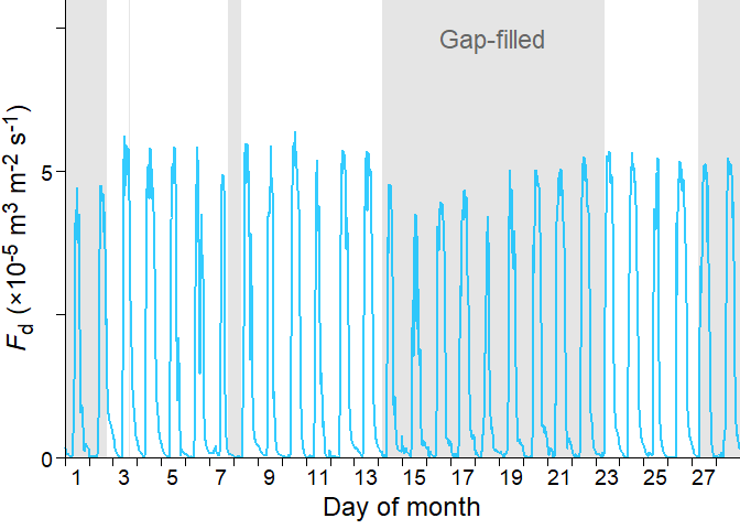 The shaded area represents the gap-filled period by the random forest model. You can see that the imputed time series reproduced the diurnal cycle of the non-imputed time series successfully.