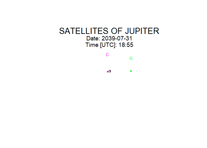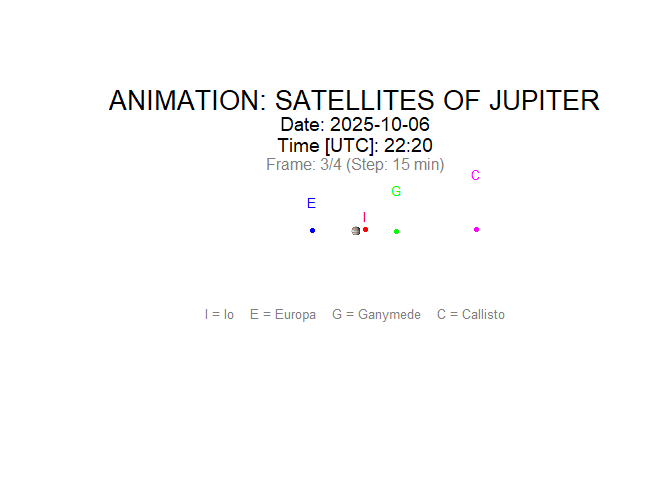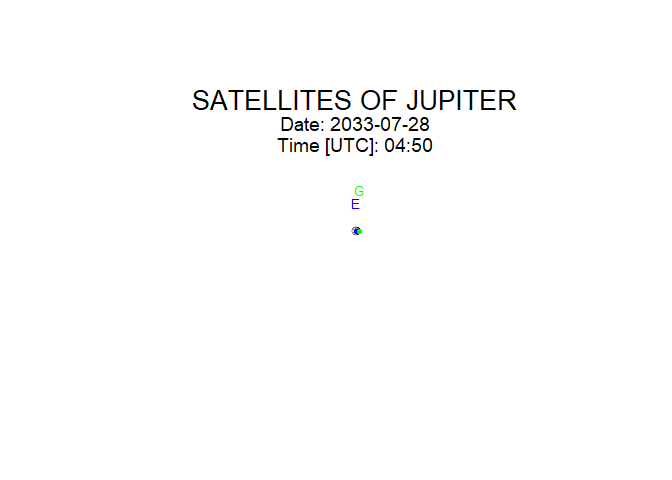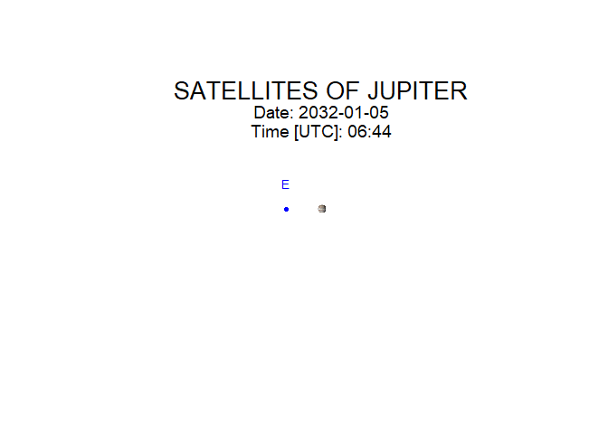 The galsat_animate() function creates an animation of the Galilean satellites’ positions. You provide the starting time, duration, the time step between frames, and the pause between frames.