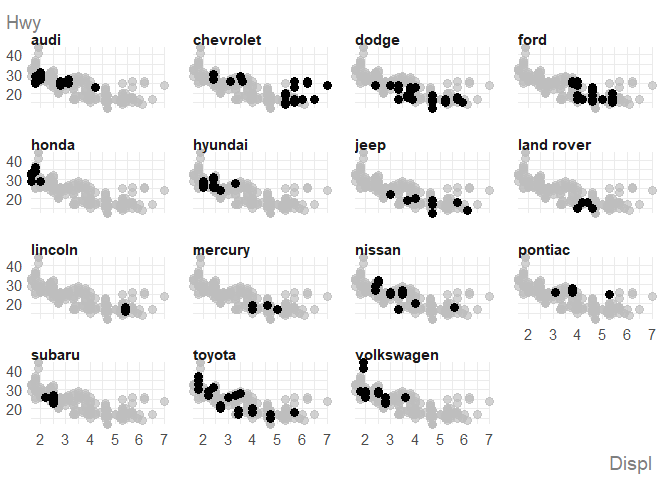 ggauto(displ, hwy, manufacturer)