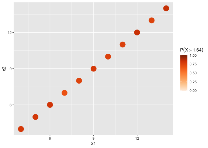 Like scale_*_bivariate(), scale_*_exceed() in ggincerta can be applied to data types beyond sf. Note that it currently computes exceedance probabilities under a normal distribution only, taking the first variable as mean and the second as standard deviation with a default threshold of 1.64. To change the threshold, call scale_*_exceed() explicitly and pass the desired arguments.
