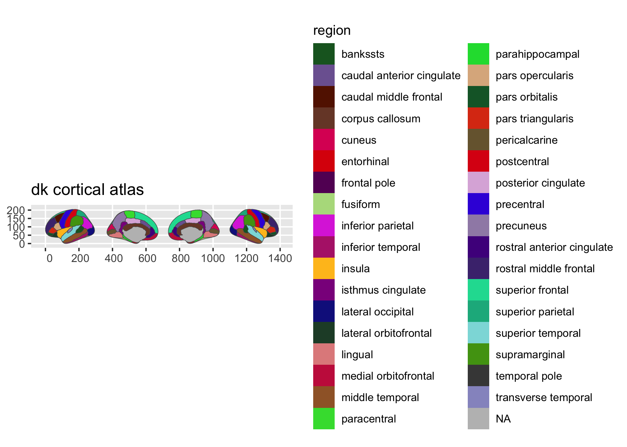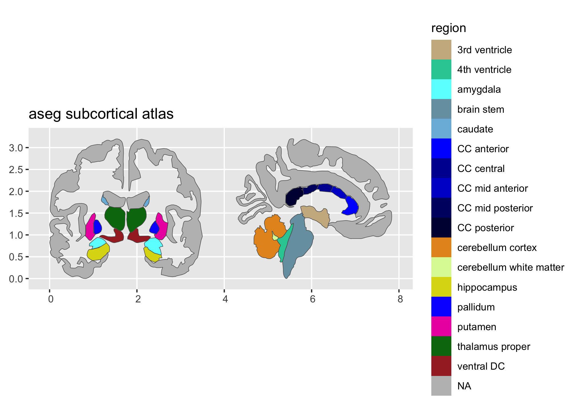 Contains ggplot2 geom for plotting brain atlases using simple features. The largest component of the package is the data for the two built-in atlases. Plotting results of analyses on regions or networks often involves swapping between statistical tools, like R, and software for brain imaging to correctly visualise analysis results.