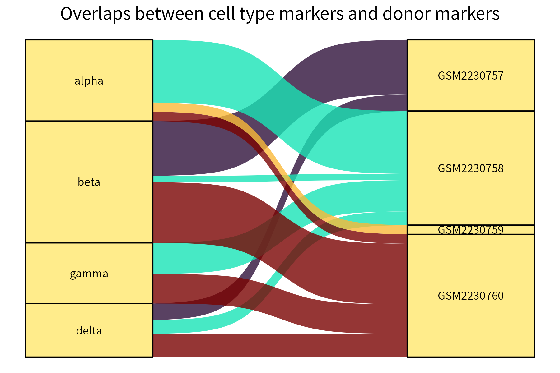 In the example below, it represents the significance of pairs of overlaps between the markers of groups belonging to two identity classes (cell type and donor).
