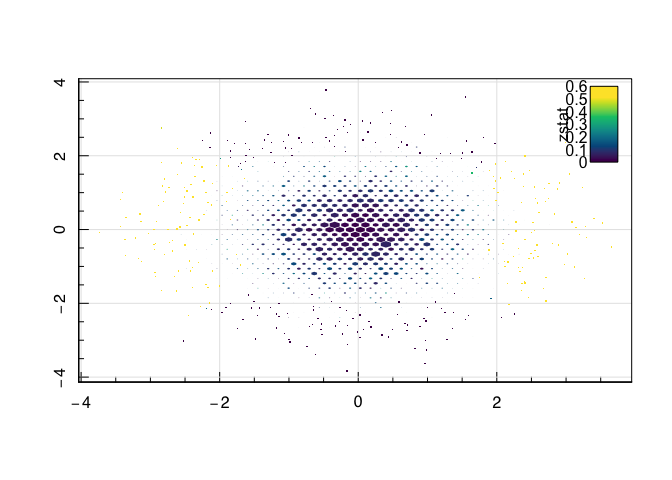 magbin(xydata, z=xydata[,1]^2-xydata[,2]^2, colref='zstat', sizeref='count')