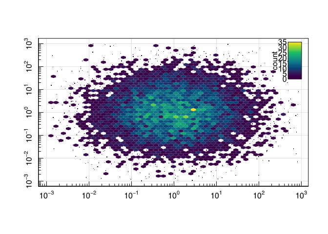 magbin(xydata, shape='hexagon', step=c(0.2,0.4)) #different aspect ratio hexagons