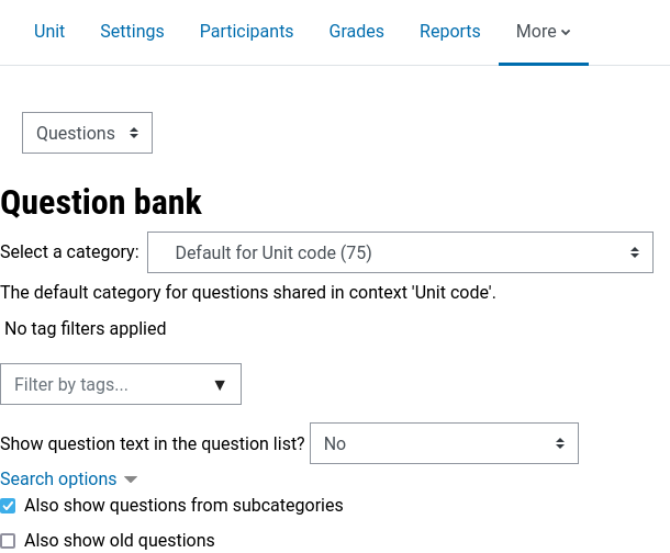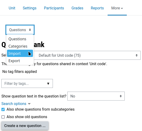 To import the quiz into Moodle, go to your Moodle course’s question bank. The navigation may vary among institutions, so if you struggle to find it the URL pattern is: https://<DOMAIN>/question/edit.php?courseid=<COURSE ID> (where <COURSE_ID> is the number found in most URLs of your course).