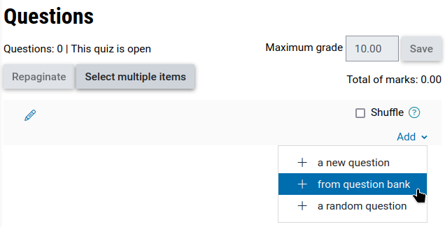 When adding a question, select “from question bank” (or “a random question” for random questions within categories).
