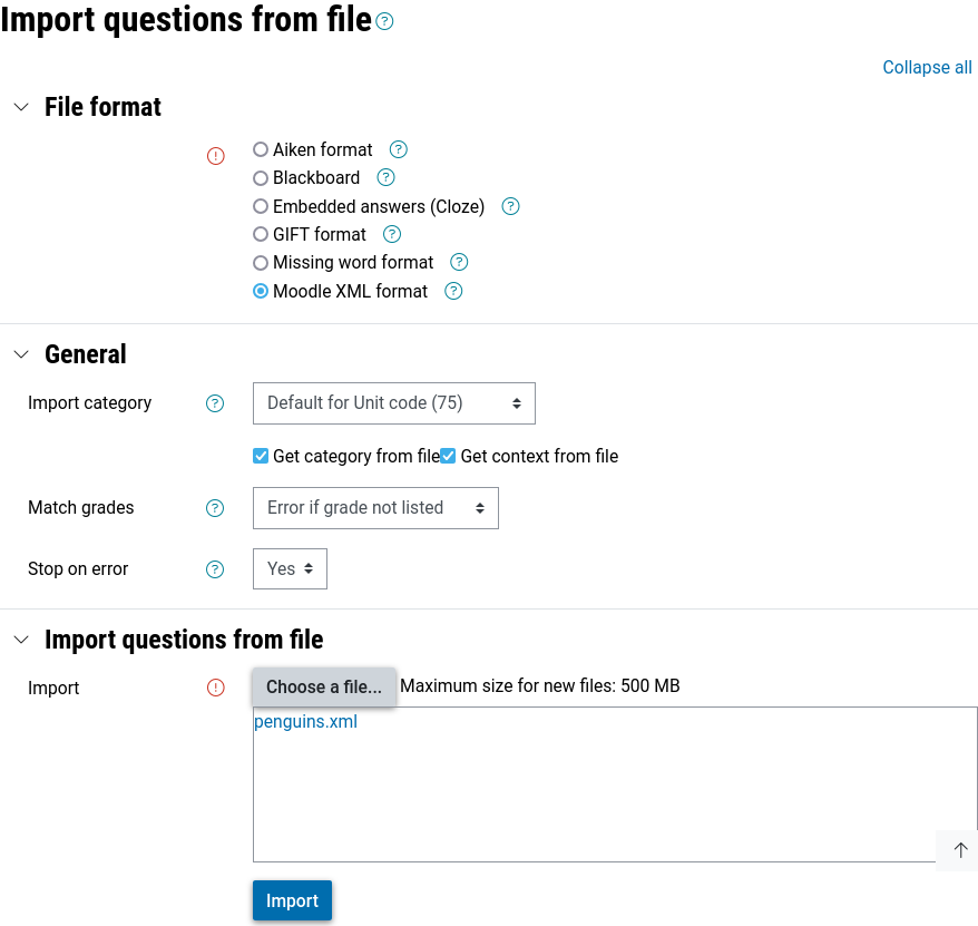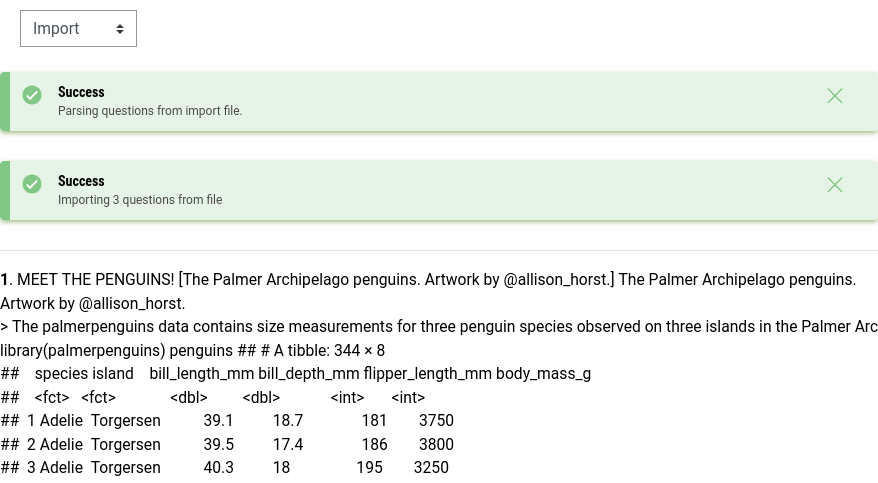 In this case the questions will be imported into the ‘penguins’ category, with only 1 replicate for each question (the default).