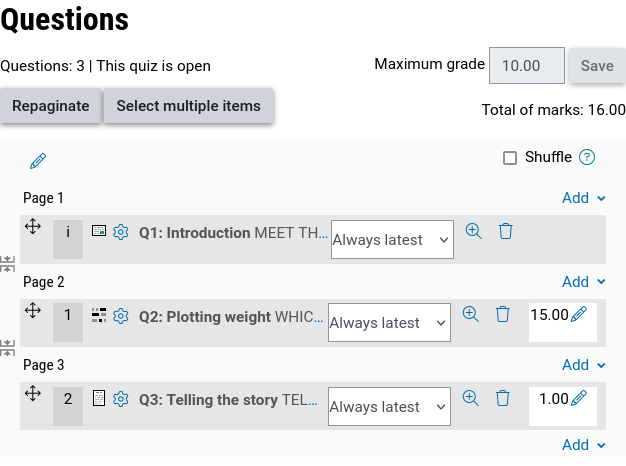 These question types often have many question-specific options which are outlined in the Moodle XML format guide. Question specific options are specified in the question headers, for example enabling shuffleanswers for multiple choice questions with ## Multiple choice {type=multichoice shuffleanswers=1}.