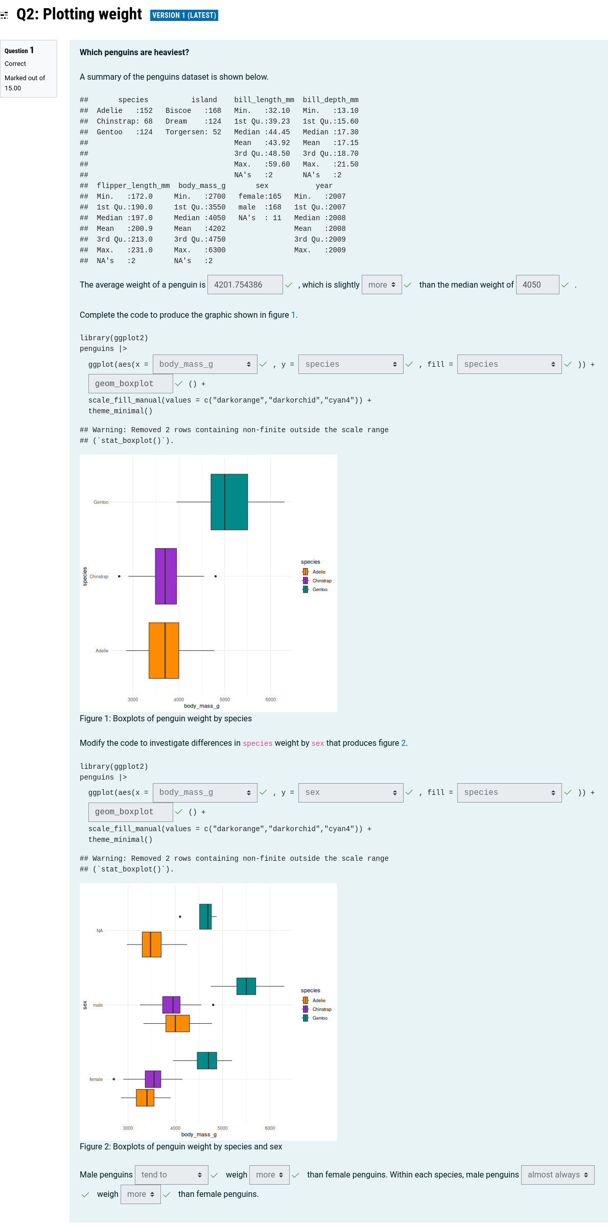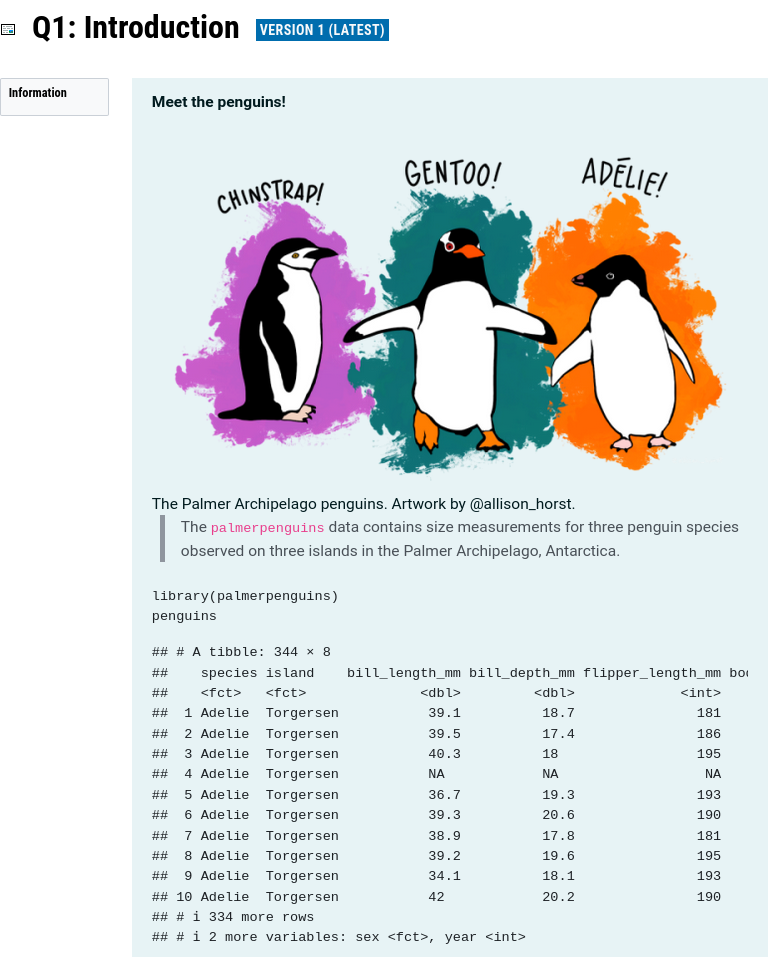 In this example, a description question is used to provide background context about the Palmer Archipelago penguins (along with a lovely illustration and preview of the dataset). Both the image and table will be bundled into the XML and imported as part of the Moodle quiz question.