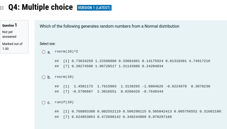 The R Markdown document’s body is used to create quiz questions with full markdown support. Any typical markdown output including figures, equations, tables and cross-references (excepting interactive outputs #31) will be imported as part of your Moodle quiz questions. As a literate programming user, writing quiz questions with full markdown support is a wonderful experience compared to the usual quiz creation workflow in Moodle.