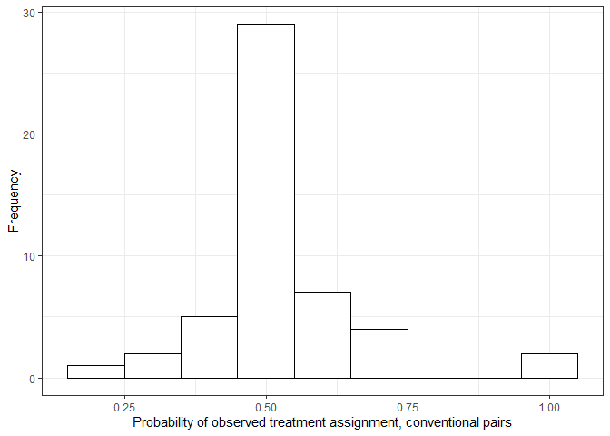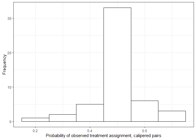 #> 8    8  28Matched pairs formed without using the dose assignment discrepancy caliper may have probabilities of observed treatment assignment heavily deviate from \(0.5\), as shown in the plot below.