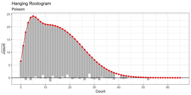We see that the hanging rootogram indicates good fit, as would be expected. More flexible models and additional model checking diagnostics are also available.