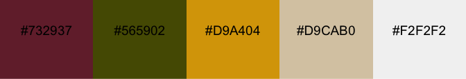 #> [1] "#732937" "#565902" "#D9A404" "#D9CAB0" "#F2F2F2"