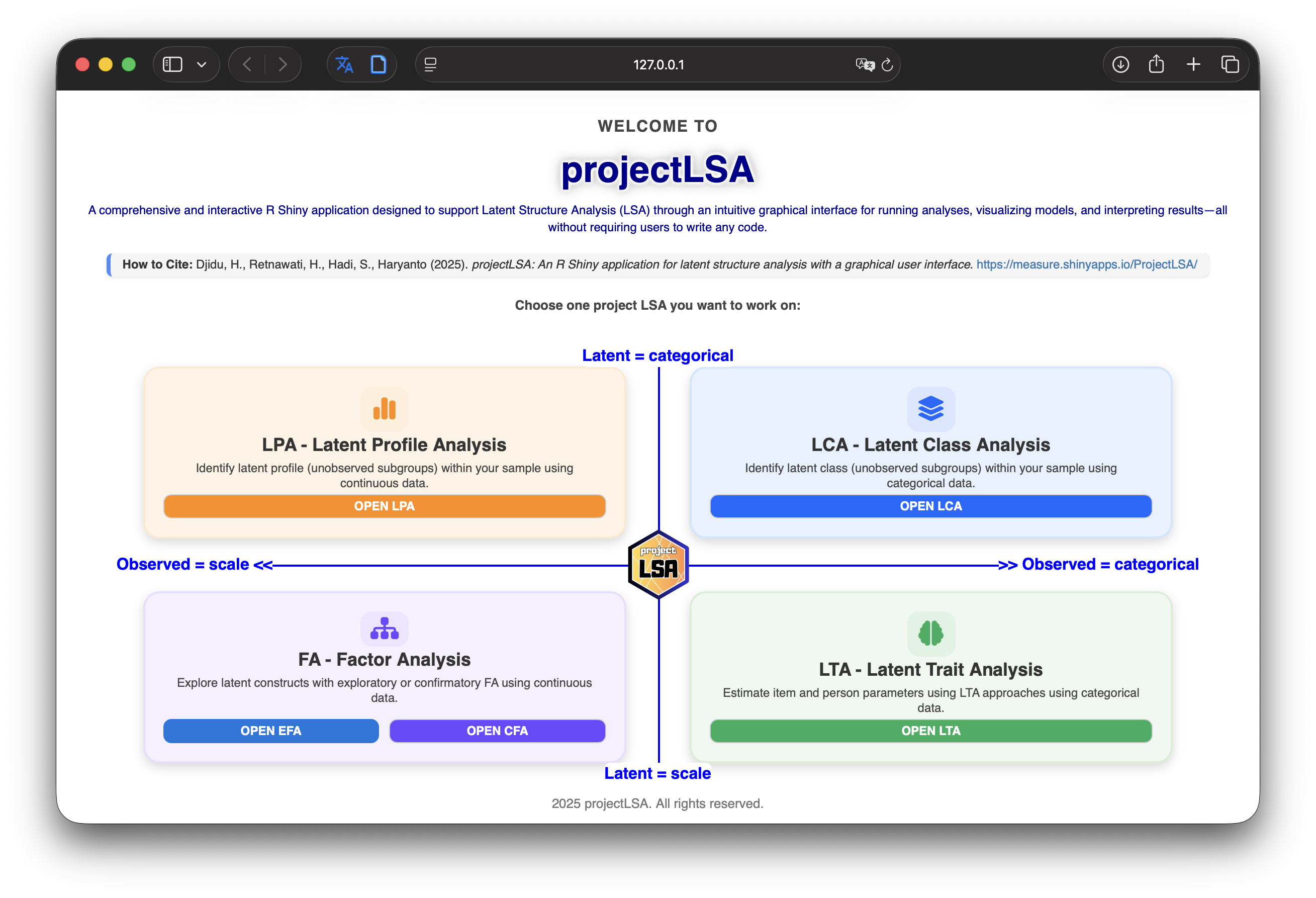 Djidu, H., Retnawati, H., Hadi, S., & Haryanto (2025). projectLSA: An R Shiny application for latent structure analysis with a graphical user interface.