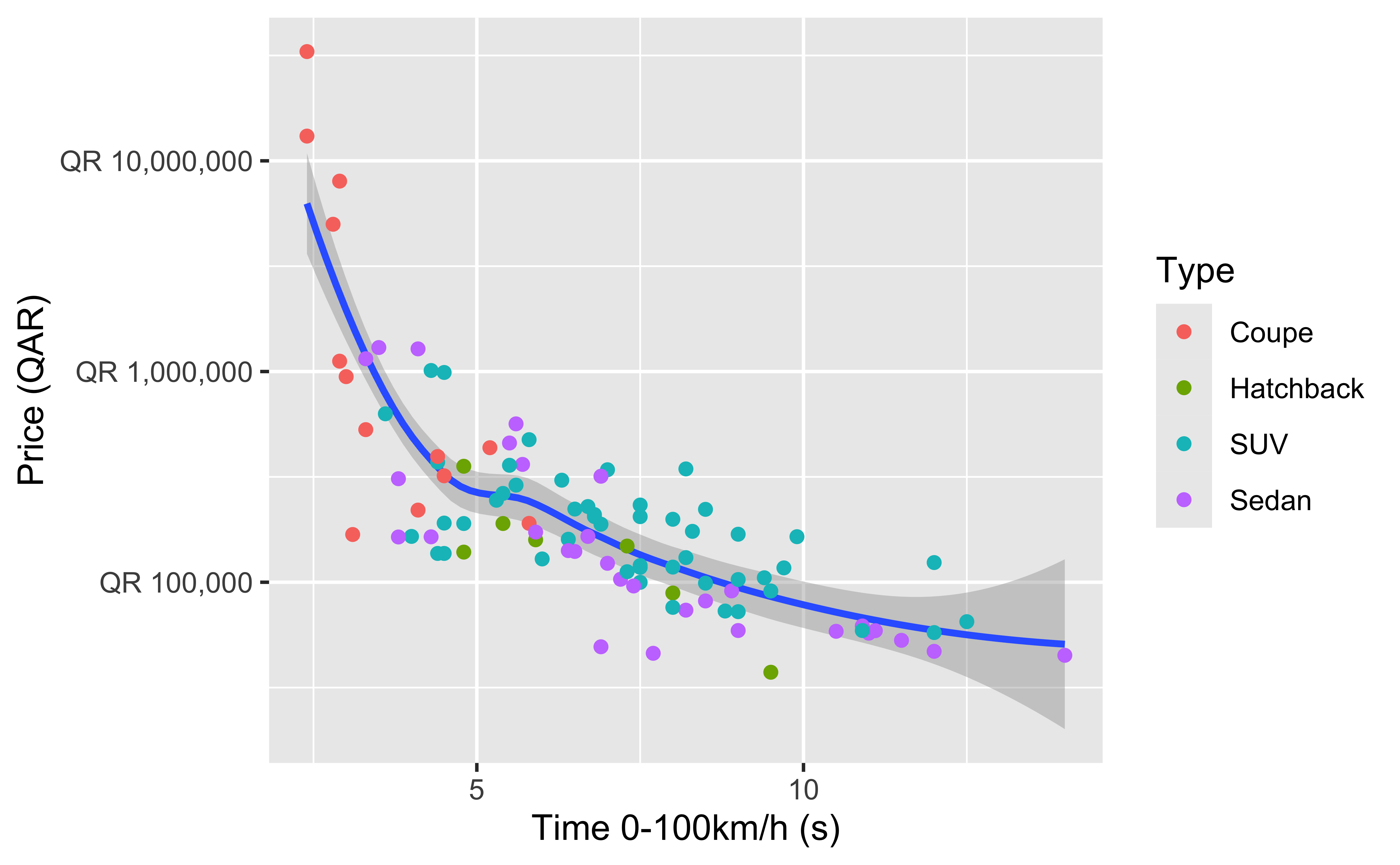 ggplot(qatarcars, aes(x = performance, y = price)) +