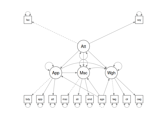 Here, we have latent variables Appearance, Attractiveness, Muscle and Weight that measure the motivation of people going to a gym to workout.