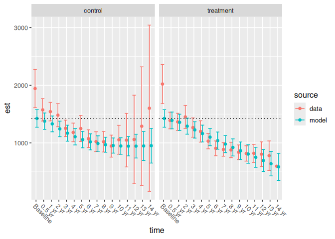 We again include horizontal lines to demonstrate that the study arms all have the same modeled mean baseline estimate: