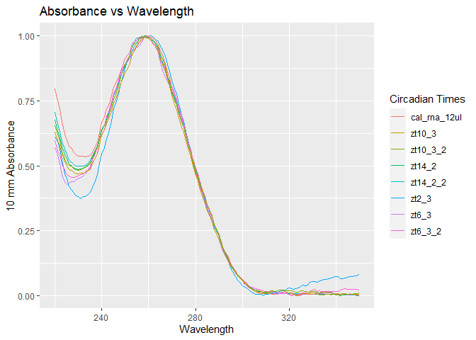 labs(title = 'Absorbance vs Wavelength', x = 'Wavelength', y='10 mm Absorbance', color='Circadian Times')
