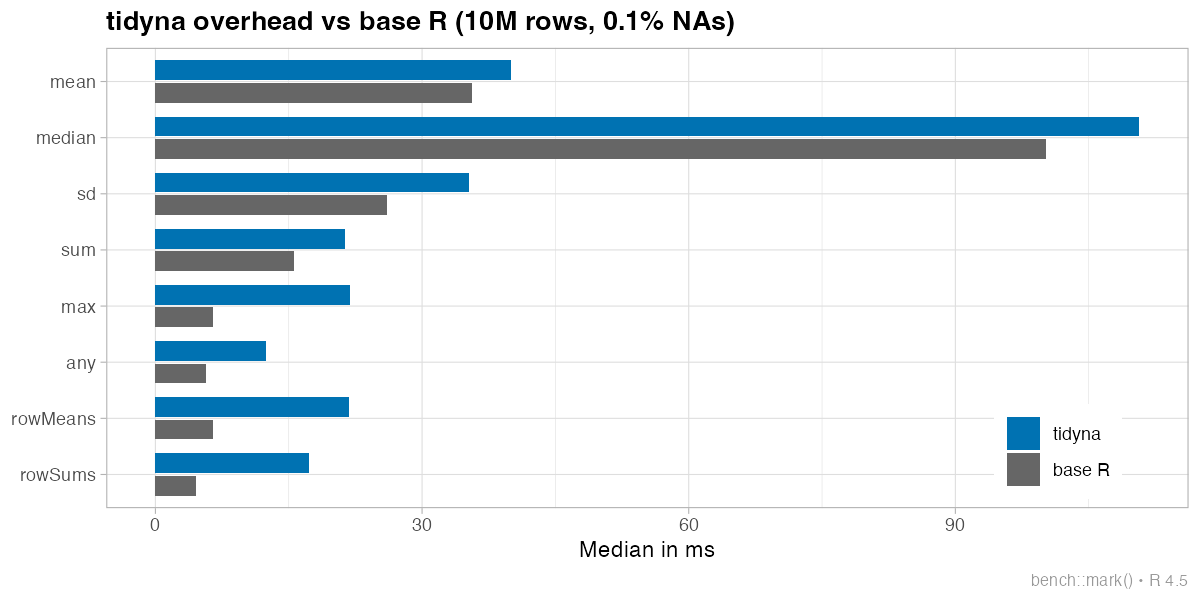 For most functions like mean() the overhead is negligible (1.1x). But rowMeans() and rowSums() require an extra pass to detect all-NA rows, so there is a substantial loss (3-4x).